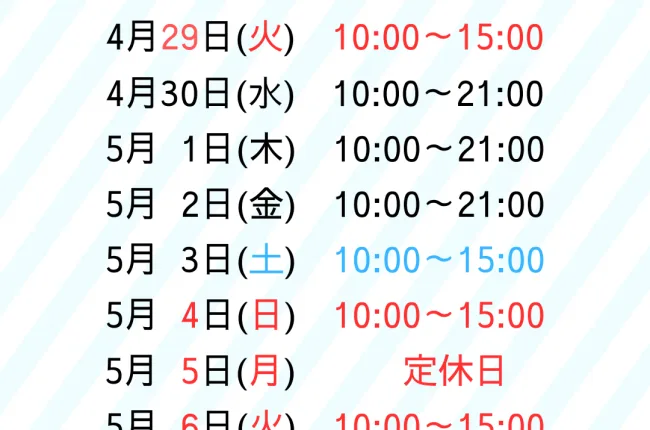 GW中の診療について皆さまこんにちは、治療院GAKU院長大久保です。さて来週よりゴールデンウィークになりますが、当院ではGW中も診療致します。日ごろなかなか体のメンテナンスができな